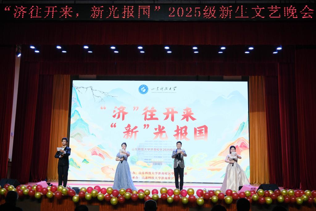 9月27日晚,济南校区在艺体楼举行“‘济’往开来 ‘新’光报国”2025级新生文艺晚会。济南校区主任郭加书,校区党委委员毛庆东、孙国强、刘西奎、刘国栋及相关部门负责人出席活动。全体学生工作干部、2025级新生及部分高年级学生参加晚会。