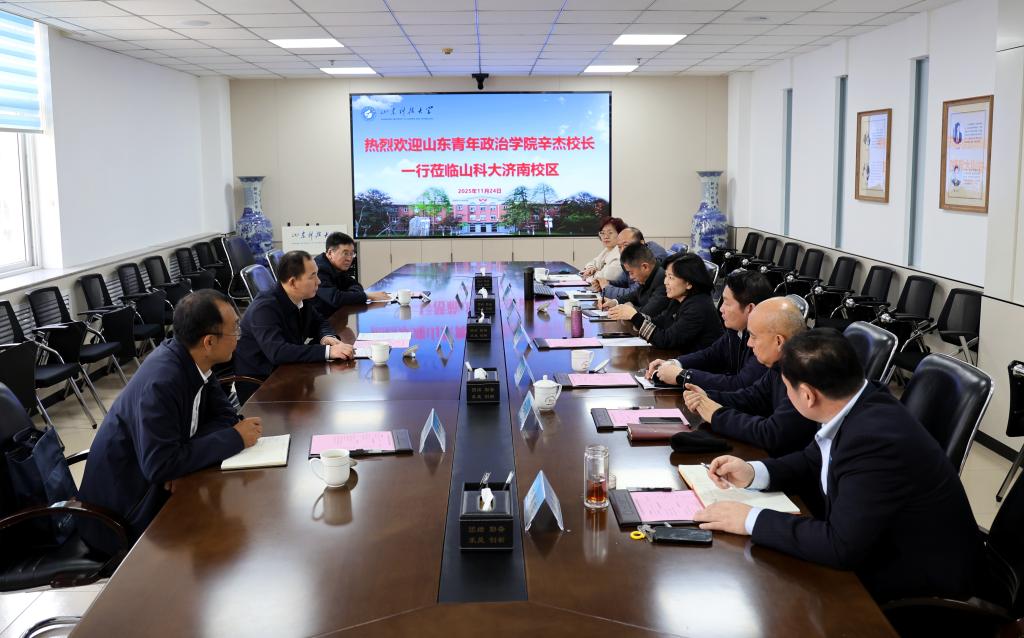 11月24日,山东青年政治学院校长辛杰、副校长张杰、国际交流合作处处长辛德军一行到校区调研交流。校党委副书记郭益灵会见客人并座谈交流。