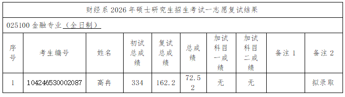 根据《山东科技大学2026年硕士研究生复试录取工作方案》《山东科技大学财经系2026年硕士研究生复试录取工作实施细则》要求,我系2026年硕士研究生招生考试一志愿复试工作已结束,现将结果予以公示(名单附后)。