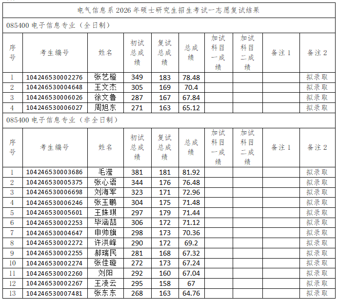 根据《山东科技大学2026年硕士研究生复试录取工作方案》《山东科技大学电气信息系2026年硕士研究生复试录取工作实施细则》要求,我系2026年硕士研究生招生考试一志愿复试工作已结束,现将结果予以公示(名单附后)。
