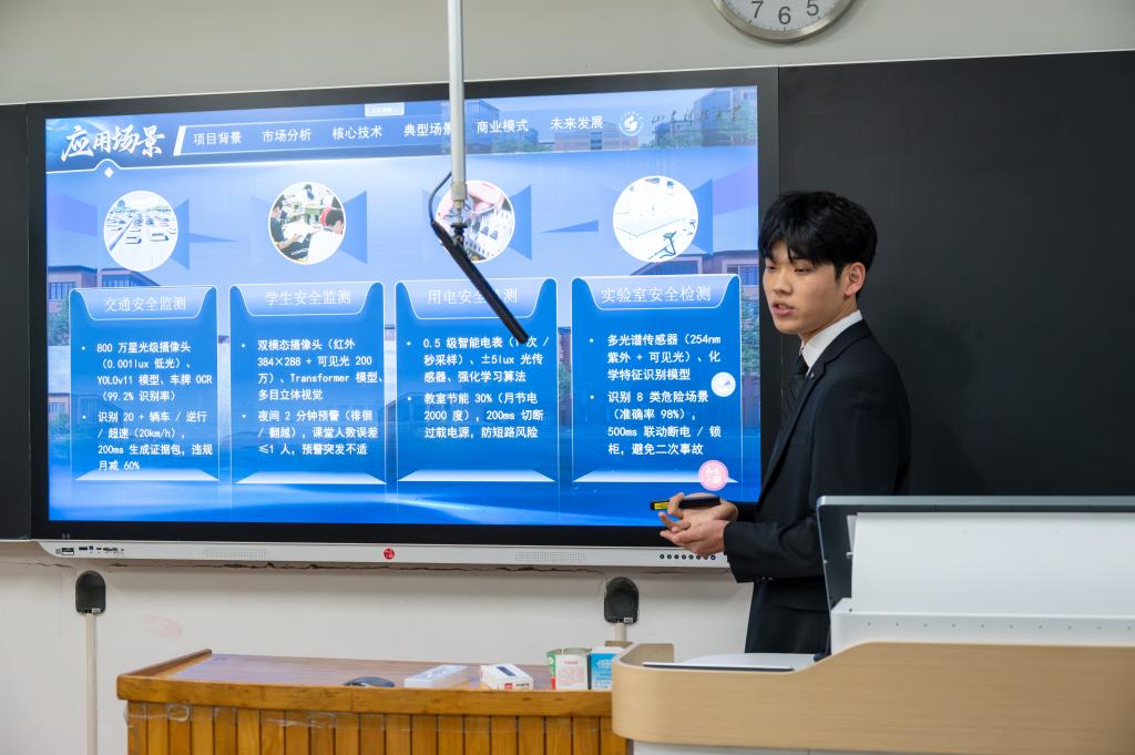 比赛现场,选手们通过详实的数据支撑、清晰的逻辑阐述和从容的现场表现,深度解读项目技术细节,同时凸显项目的社会价值。在答辩环节中,他们不仅展示了创新成果,更体现了服务社会、解决实际问题的担当精神。