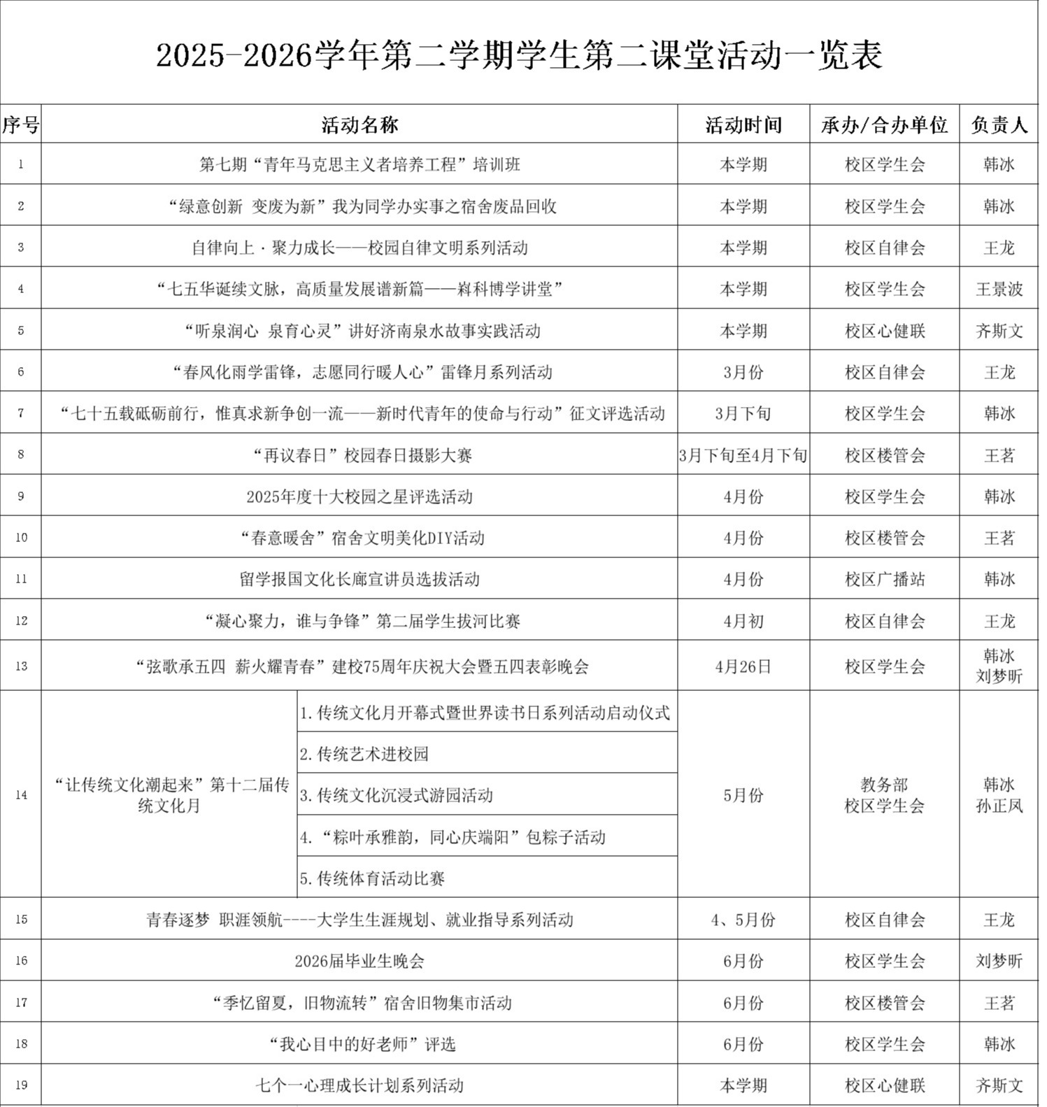 2025-2026学年第二学期学生第二课堂活动一览表