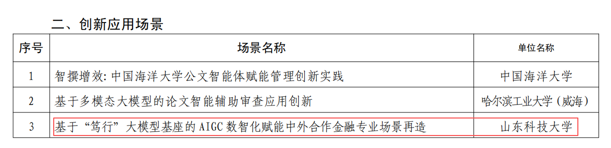 近日,山东省教育厅公布人工智能大模型赋能教育典型案例及创新应用场景评选结果,由金融系汤巍老师主持的项目 “基于‘笃行’大模型基座的 AIGC 数智化赋能中外合作金融专业场景再造” 成功入选创新应用场景名单,成为全省教育系统人工智能与教育融合创新的标杆项目之一。