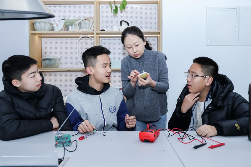 在Project工程素质培养中心,牛君副教授带领同学们开启了沉浸式科技探索之旅。同学们近距离观摩了在校本科生自主研发的机器人、小型收音机等科创成果,充分感受了高校学子的创新思维与实践能力,现场交流氛围热烈。在实践体验环节,牛教授细致指导同学们在面包板上完成电阻、LED灯等组装工作,借助电学原理成功实现红、绿、黄三色点亮。同学们分组协作、动手实操,在实践中深化了对物理知识的理解,切实体悟到工程制作的严谨性与科技创新的独特魅力。