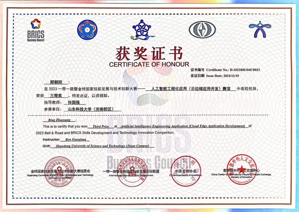 近日,2023年一带一路暨金砖国家技能发展与技术创新大赛系列赛相继公布成绩,斯威本学院学生邴朝阳(指导教师:任国强)参加了人工智能工程化应用(云边端应用开发)、财经素养两个赛项的比赛,并在两个赛项中分别取得全国三等奖、一等奖的佳绩。济南校区也因此获得2023年一带一路暨金砖国家技能发展与技术创新大赛-财经素养赛项(本科组)最佳组织奖。