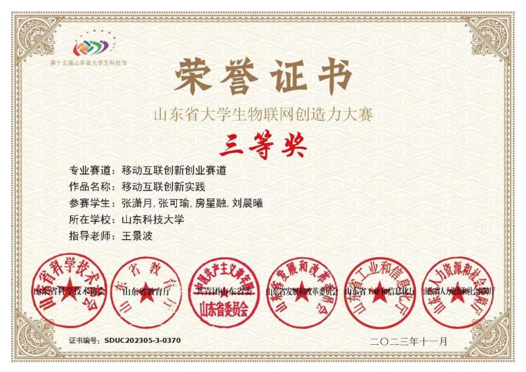 近日,第十五届山东省大学生科技节——“有人杯”第十届山东省物联网创造力大赛(iSTAR2023)获奖名单公布。斯威本学院共有13支队伍参加了物联网创造力大赛移动互联创新创业赛道的比赛,经过激烈角逐,获得省一等奖2项、二等奖2项、三等奖3项。