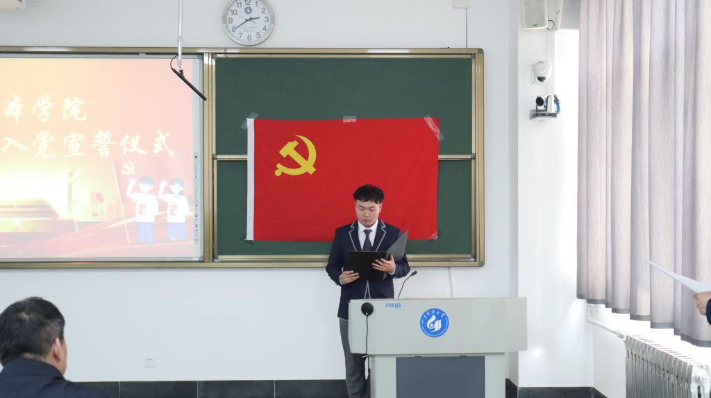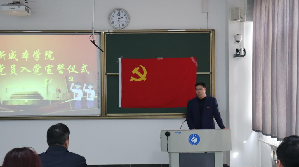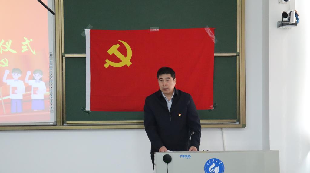 仪式在庄严的《国际歌》中拉开帷幕,5名新党员佩戴党员徽章,在辅导员张越老师带领下,面向党旗庄严宣誓,立下“为共产主义奋斗终身”的誓言。学院党委副书记赵长青代表学院党委讲话,他首先向光荣加入中国共产党的5位新同志表达了热烈祝贺,并希望入党积极分子向新党员学习、积极向党组织靠拢。随后,赵长青从中国共产党百年光辉历程讲起,结合国际形势与中国特色社会主义发展道路,展现了中国共产党的正确领导和光辉业绩。他说:入党誓词虽短,但字字千斤,内涵丰富,需要每一名党员用自己的模范行为去实践,终生为之奋斗。作为学生党员要严格遵守党的纪律,时时处处以一名共产党员的标准来衡量自己的一言一行,切实增强“四个意识”、坚定“四个自信”、做到“两个维护”,坚定不移地从思想和行动上同党中央保持高度一致,胸怀祖国,服务人民,把个人发展融入党的伟大事业中。赵长青对新党员如何发挥引领示范作用,提出四点要求:一要坚定理想信念,做信仰坚定的表率,认真学习贯彻党的二十大精神,用习近平新时代中国特色社会主义思想武装头脑。二要刻苦学习,做学习上的标兵,明确个人的学习目标,刻苦钻研科学文化知识,引领积极向上的班风、院风、校风。三要服务奉献,做社会工作的典范,牢记全心全意为人民服务的宗旨,服务好为学校、学院的发展,服务好班级、宿舍的和谐建设。四要文明修身,做热爱生活的榜样,践行文明、健康、进步的生活方式,主动承担任务,做到知信行统一,展示共产党人的风范与魅力。