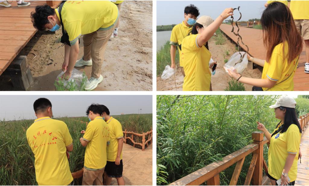 7月14日,实践团来到东营黄河入海口生态旅游区,到黄河边黄河入海口、万亩槐林森林和入海口湿地进行实地参观考察,实地查看黄河河道水情和黄河三角洲湿地生态环境,了解黄河流域生态保护和高质量发展等情况。在实地调研过程中,团队成员践行“不怕苦。不怕累”的精神,相互配合、分工合作,观察河道两岸的植被分布,并对河道两岸的生活垃圾、枯木烂枝、农药包装、杂草等进行清理,用实际行动诠释青春的责任与担当。