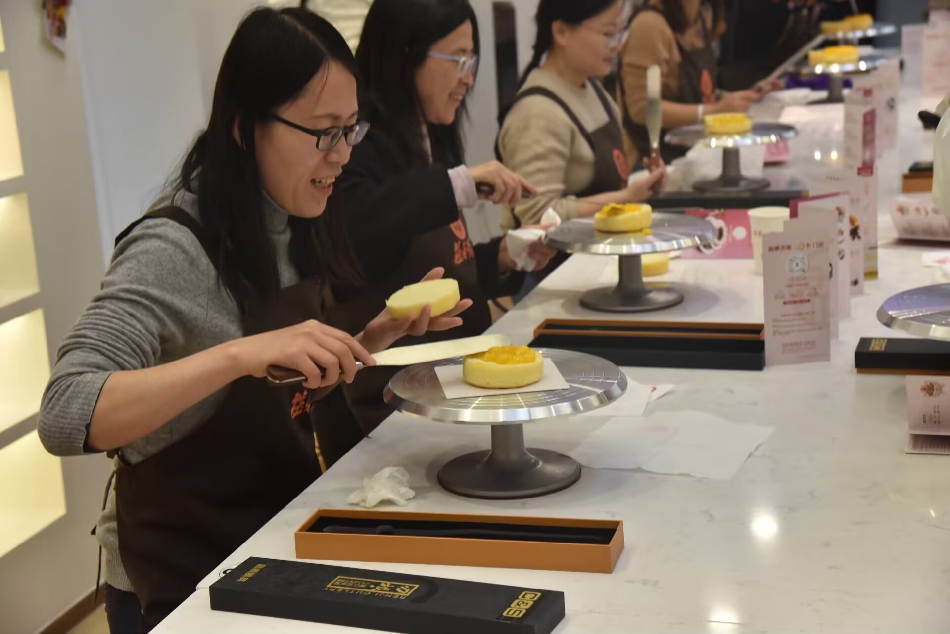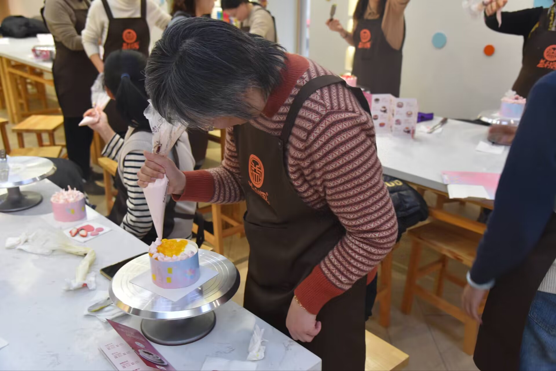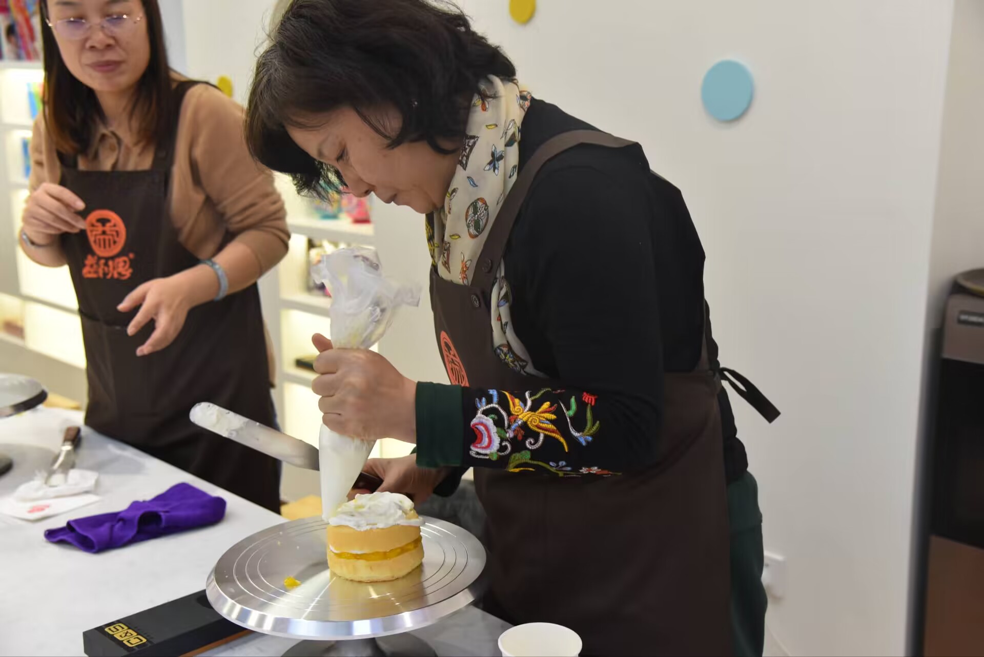活动中,蛋糕师向大家详细讲解了制作蛋糕的基础知识,包括选用食材,抹胚、摆放水果的技巧等。大家以蛋糕胚为画布,刮刀为笔,发挥自己的奇思妙想,将水果、奶油与糖霜碰撞组合出一个个精美的蛋糕,展示着糕点的艺术之美,治愈心灵、解压生活。活动现场气氛热烈欢快,大家互帮互助,共同创作,相互学习,耐心装点,搭配组合出一个又一个芳香四溢,香酥可口的精致蛋糕。