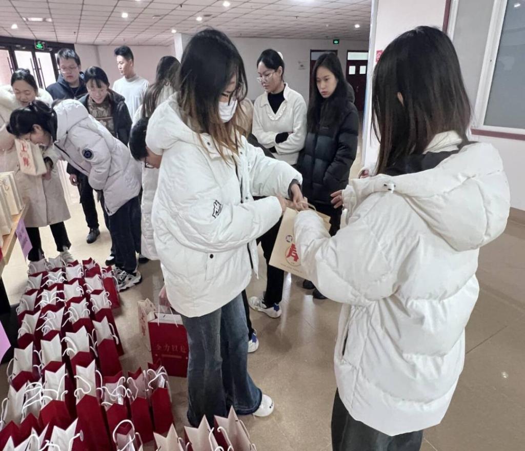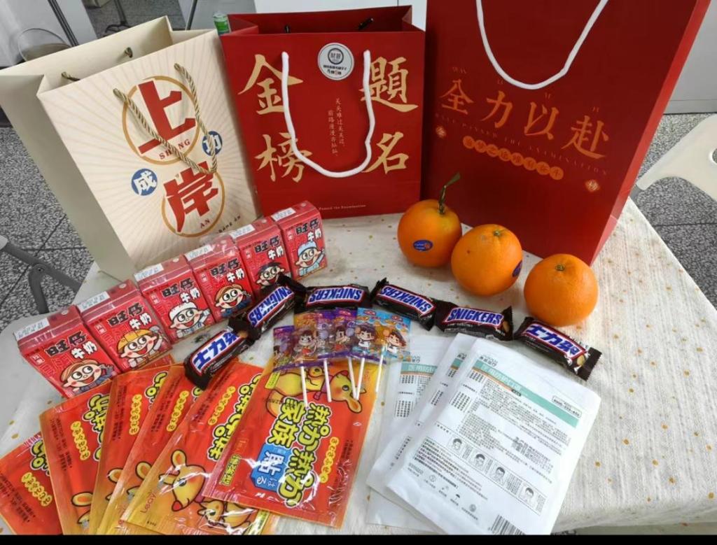 从写满“全力以赴”“成功上岸”“金榜题名”祝福语的包装纸袋,到“喝了就会旺”的旺仔牛奶、“横扫一切”的士力架、“心想事成”的柳橙、“加油”棒棒糖,再到呵护考生健康赴考的发热暖贴、N95口罩等,一件件由辅导员亲自为考生精心挑选的小礼物,汇聚起满满正能量,为参加2024年硕士研究生考试的学生全面“保驾护航”。
