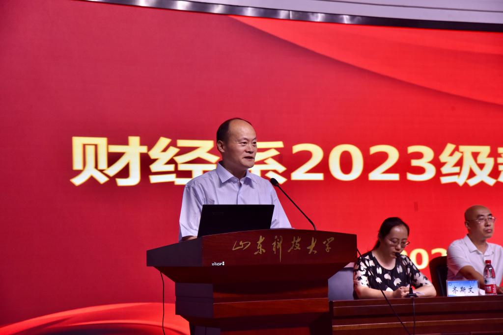 财经系主任施宙以“踔厉奋发勇毅前行成就更加优秀更加精彩的自己”为题为新生讲授了“开学第一课”。他首先代表财经系师生对2023级新生经历疫情和升学双重“大考”以优异成绩圆梦山东科技大学表示热烈的欢迎和祝贺,随后简要介绍了山东科技大学和财经系的情况,特别谈到2023届金融学专业毕业生取得的62%的深造率情况。提出面对充满不确定性的后疫情时代,只有学习才能使大家有能力驾驭这个充满挑战的世界,获得更多的机会和可能,并对大家即将开始的学习生活提出四点希望: