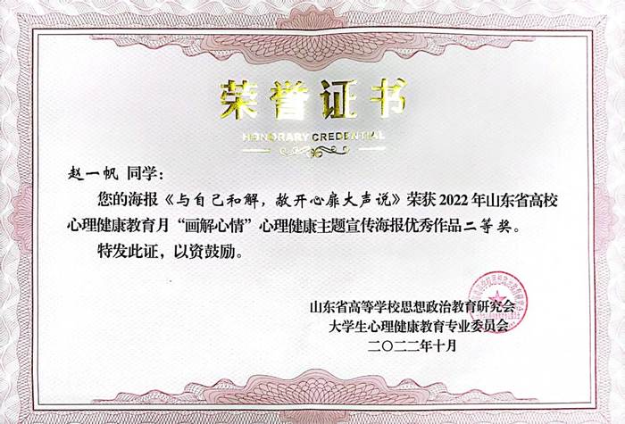 近日,山东省高等思想政治教育研究会大学生心理健康教育专委会公布了2022年山东省高校心理健康月展示活动评选结果,我系学生赵一帆的《与自己和解,敞开心扉大声说》获心理健康主题宣传海报二等奖。