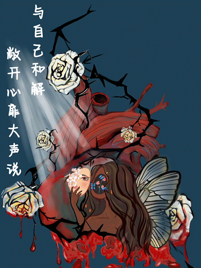 海报画面主体为一颗遍体鳞伤的心脏,展现了个体把自己封闭在内心,不愿意走出心理困境,无法照射阳光的消极状态。心中存在的“鸟语花香”世界,被虚假的“不同肤色”的面具遮挡住,暗示难以面对真实的自我,绕在心上的荆棘是用尖刺伪装和保护自己的方式,寓意在防御别人的同时也伤害了自己,面具中的花取自“话”的谐音,是在展示难以敞开的心扉。海报用强烈的视觉冲击力,引导每个人要敢于面对真实的自己,与自己和解,勇于敞开心扉去接触、去拥抱,善于发现外面的世界充满阳光和鲜花,将心中的“花”大声说出来。