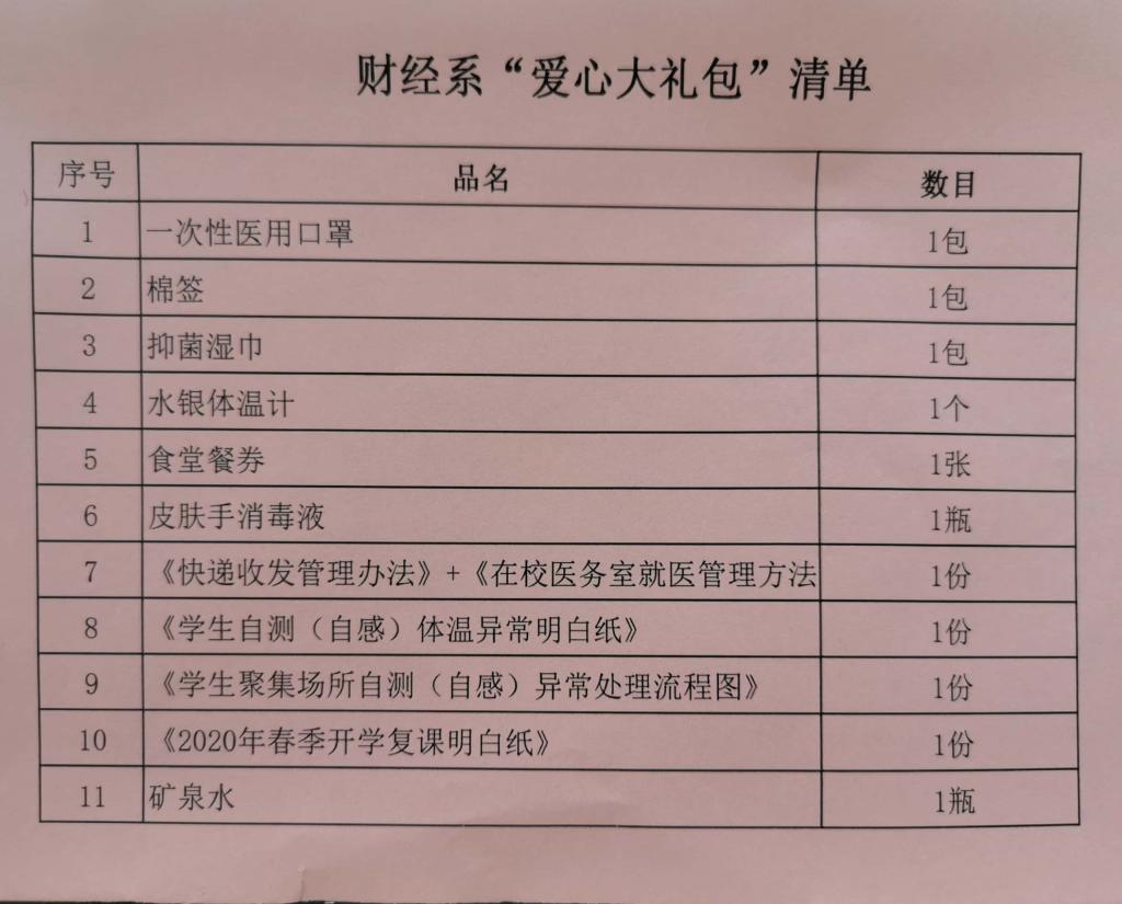 入校后,学生拿到了财经系为返校学生精心准备的“爱心大礼包”,这份爱心礼包是财经系开学防控方案其中一个重要环节,礼包中的一次性医用口罩、消毒湿巾、手部消毒液等防疫物品和学生自测(自感)异常处置流程图等常态化防控知识材料既是关心学生、爱护学生的具体体现,更是对返校学生入校后的疫情防控教育措施之一。