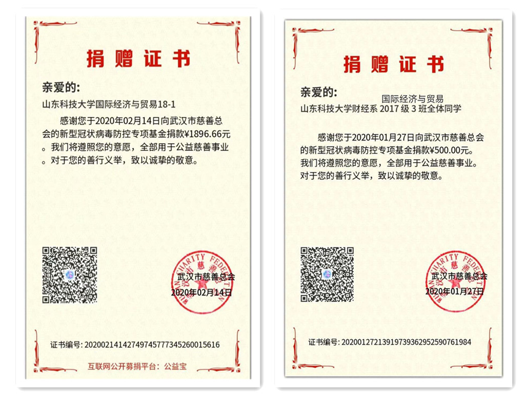 国际经济与贸易2017-3班班长贾星奥看到倡议,组织班级同学讨论,并建议拿出500元班费捐给武汉市慈善总会用于购买医疗物资,得到同学们积极响应。国际经济与贸易2018-1班在班长王泽皓的组织下,也进行了热烈讨论,除了拿出500元班费捐赠之外,同学们还自发组织个人捐赠,最终筹得爱心捐款1896.66元,全部以班级名义捐赠给武汉市慈善总会。班级捐赠代表大家的心意,彰显集体的力量,万众一心,共克时“疫”。