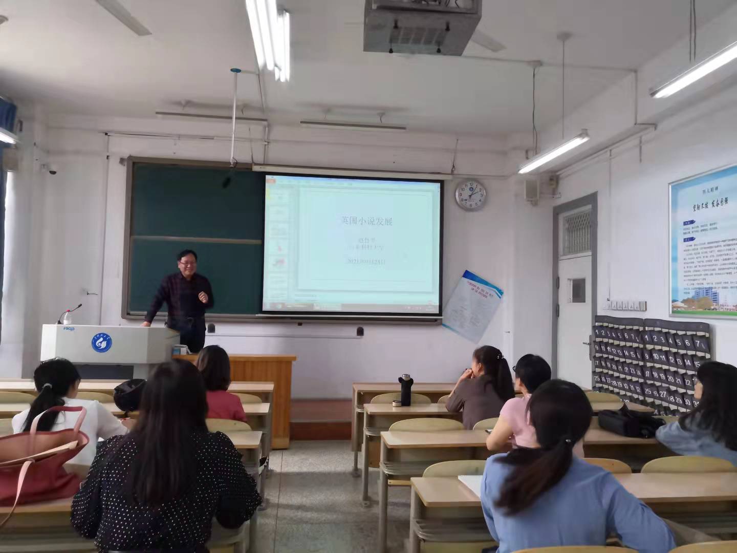 外语教研室赵鲁平教授以“英国小说发展”为题,从英国文学起源、14世纪以前的英国文学、英国小说发展三个方面与大家分享交流了英国小说的发展历史。本次讲座内容精彩、信息量大,从历史前景到当下,从文学理论到文本分析,方方面面,浑然一体,充满思辨和哲理,对提升青年教师的学术素养有一定的积极作用。